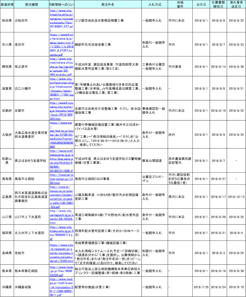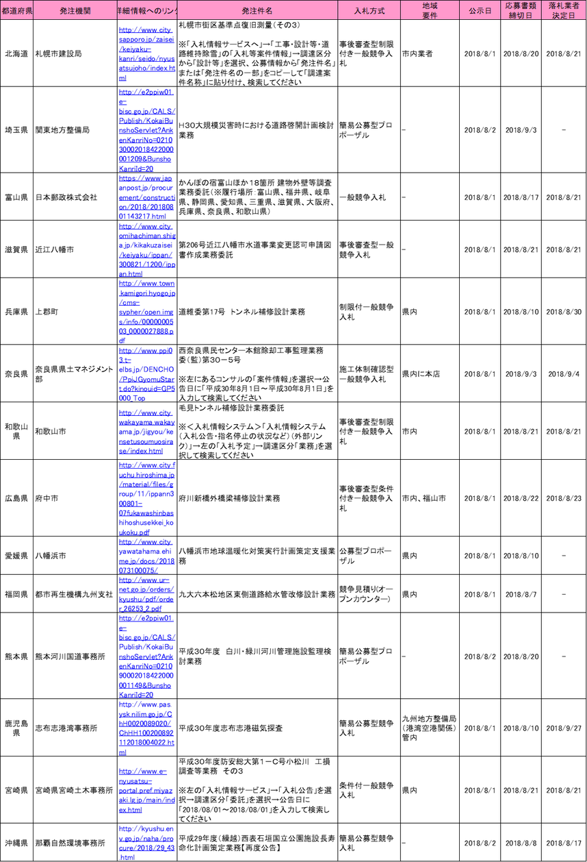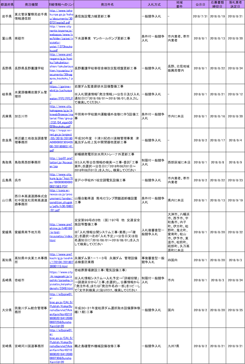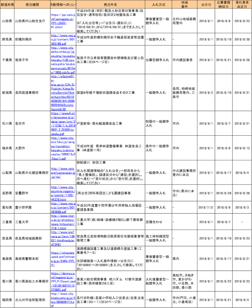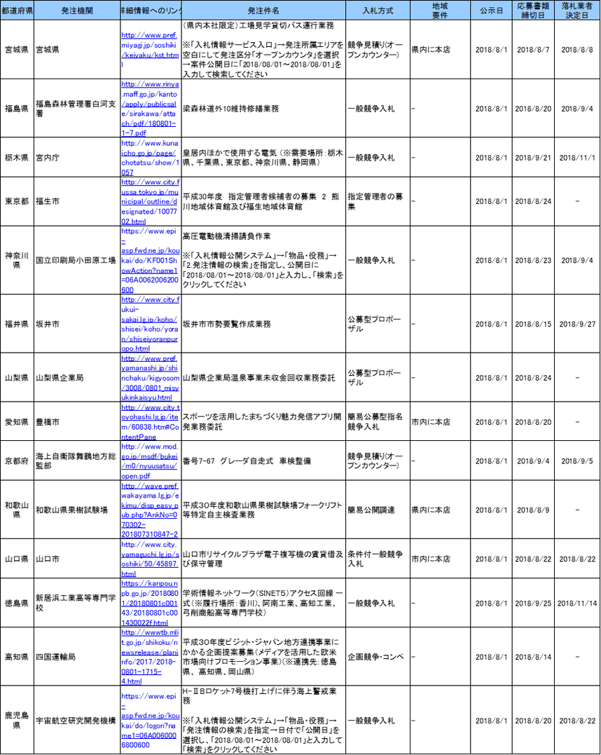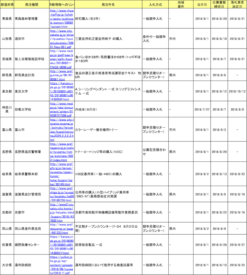 過去に配信した案件のサンプル 過去の配信データの中から、業務、役務・保守管理、物品、土木・建築系工事、電気・機械設備系工事、管工事の入札公告の実例をご紹介します。 ※表は業種ごとに見やすく加工したもので、実際のエクセルファイルとは異なります。 業務 役務・保守管理 物品 土木・建築系工事 電気・機械設備系工事 管工事